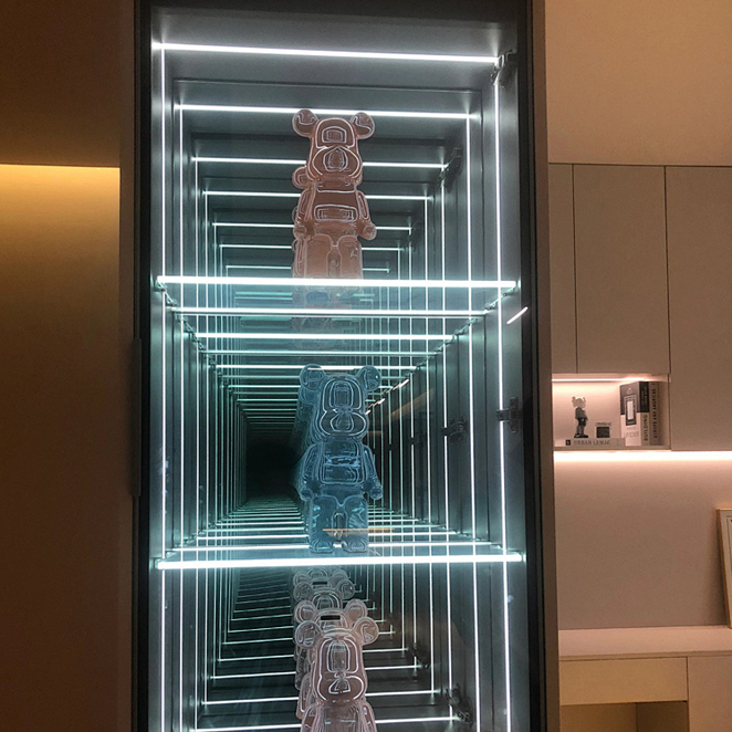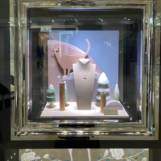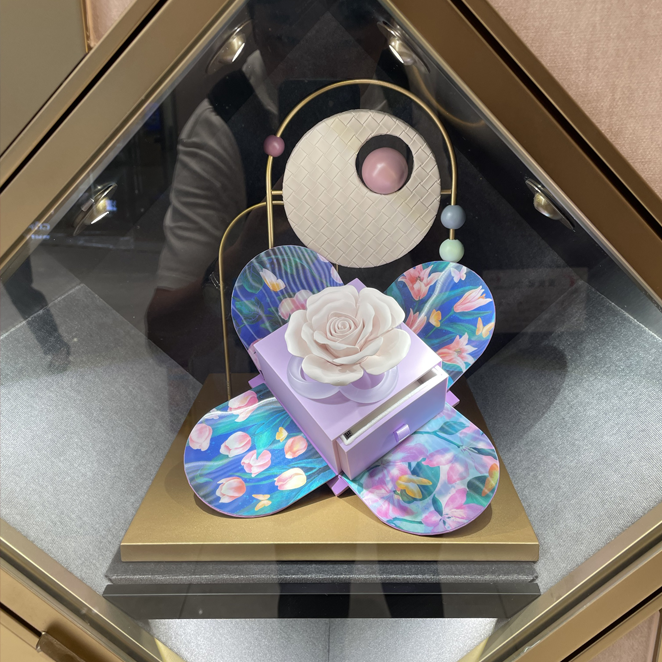 A showcase that is smaller than a regular one (like a box); Customers can immediately focus on the products in the display window, which can be a closed/open display window; This type of showcase is suitable for cosmetics stores, jewelry stores/accessory stores, and luxury brand stores; Because these products are small and delicate, it is difficult to showcase their effectiveness and value in a normal sized window display; So, focus on showcasing directly in a small space, so that customers can pay attention at a glance; And it can more intuitively and prominently showcase the selling points and quality of the product; Usually only one person is allowed to watch at a time, which invisibly helps to create a "heart to heart" between customers and products.