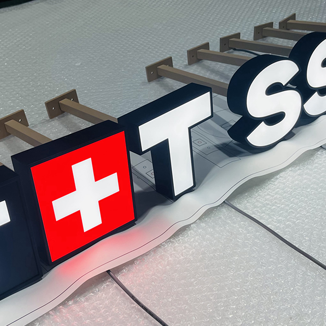 Crisp light illuminates through the custom acrylic face,